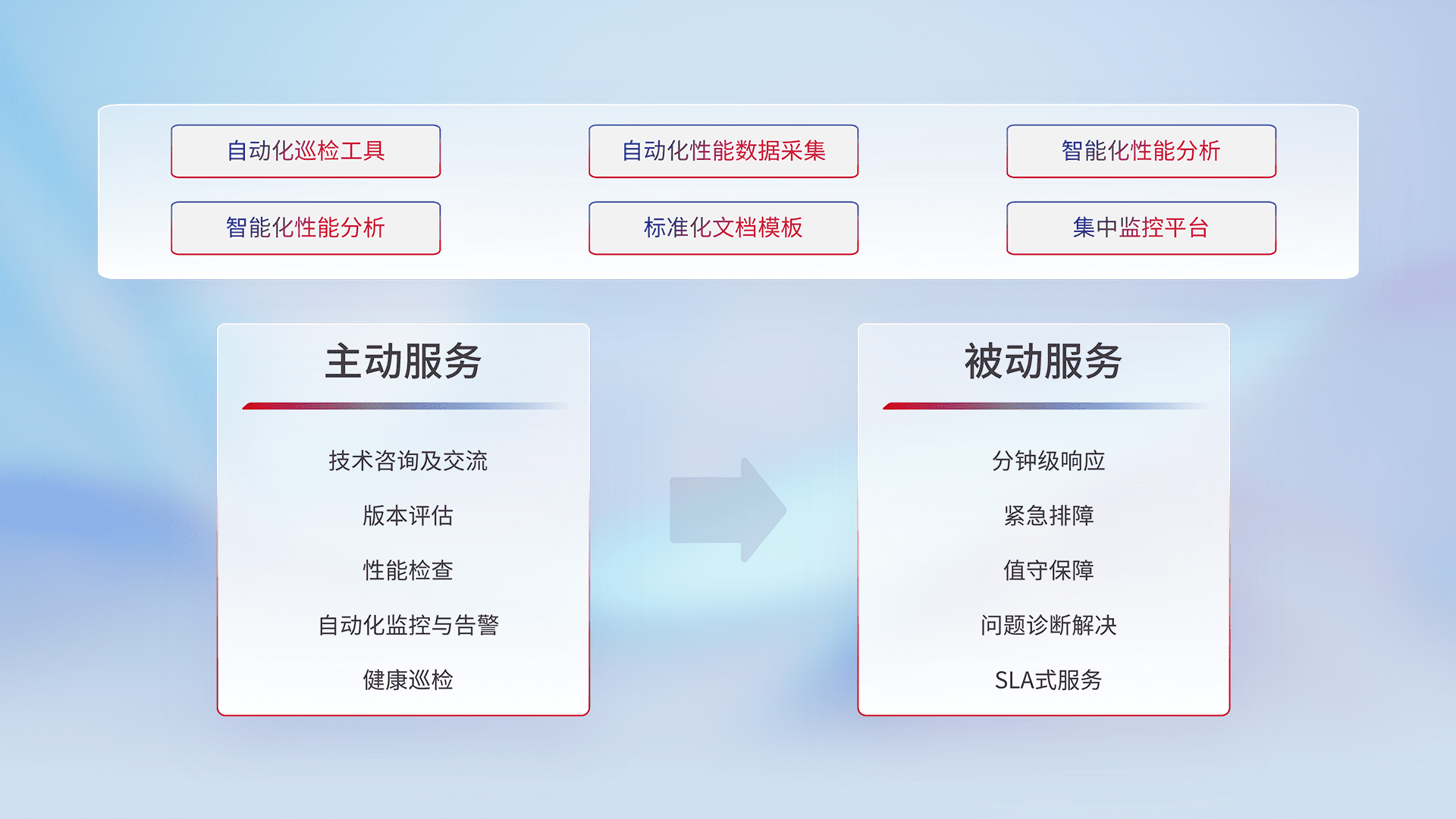 智能化工具和标准化文档,,保障服务质量,,,,提供主动服务(包含技术咨询、、、版本评估、、、性能检查、、、自动化监控与告警、、、、健康巡检)和被动服务包含(分钟级响应、、紧急排障、、、值守保障、、、、问题诊断解决、、、、SLA服务)。。。